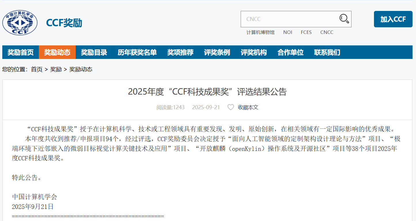 本報訊 (記者 李洋)近日,中國計算機學會(CCF)揭曉2025年度“CCF 科技成果獎”評選結(jié)果,38個項目分獲自然科學獎、技術(shù)發(fā)明獎和科技進步獎。其中,“開放麒麟(openKylin)操作系統(tǒng)及開源社區(qū)”項目憑借在核心技術(shù)突破與產(chǎn)業(yè)落地中的突出貢獻,斬獲代表該獎項最高榮譽的科技進步特等獎。openKylin作為中國“十四五”期間孕育的開源力量,由麒麟軟件發(fā)起并捐贈,由開放原子開源基金會運營,致力于打造全球領(lǐng)先的智能桌面操作系統(tǒng)開源根社區(qū)。