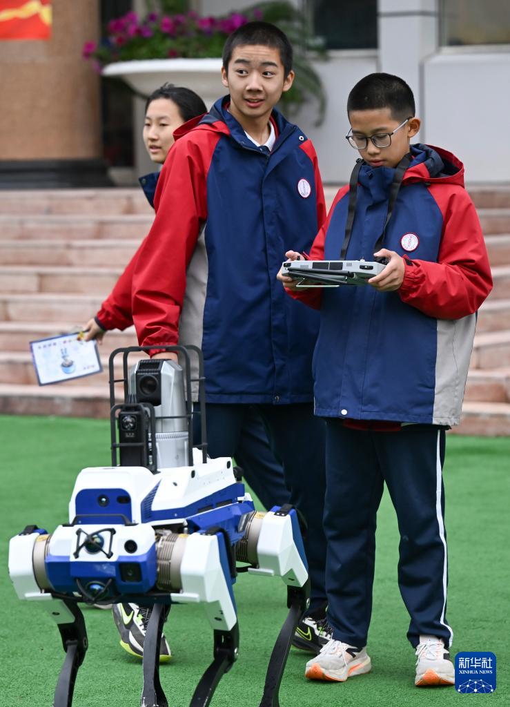 10月13日,新疆生產(chǎn)建設(shè)兵團第一中學(xué)學(xué)生在科技節(jié)開幕式上操控智能機器狗。