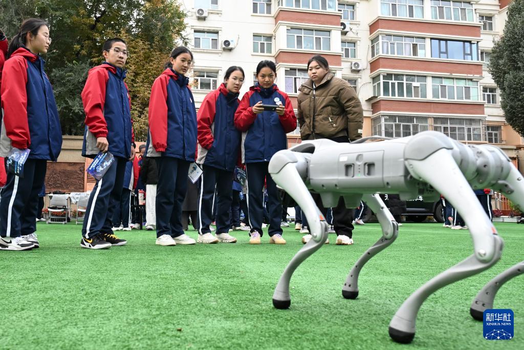 10月14日,新疆生產(chǎn)建設(shè)兵團第一中學(xué)學(xué)生觀看智能機器狗進行復(fù)雜運動。