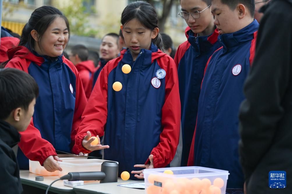 10月13日,新疆生產(chǎn)建設(shè)兵團第一中學(xué)學(xué)生在科技節(jié)開幕式上體驗科學(xué)實驗。