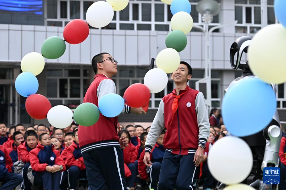 10月13日,新疆生產(chǎn)建設(shè)兵團第一中學(xué)學(xué)生在科技節(jié)開幕式上觀看智能機器人跳舞。