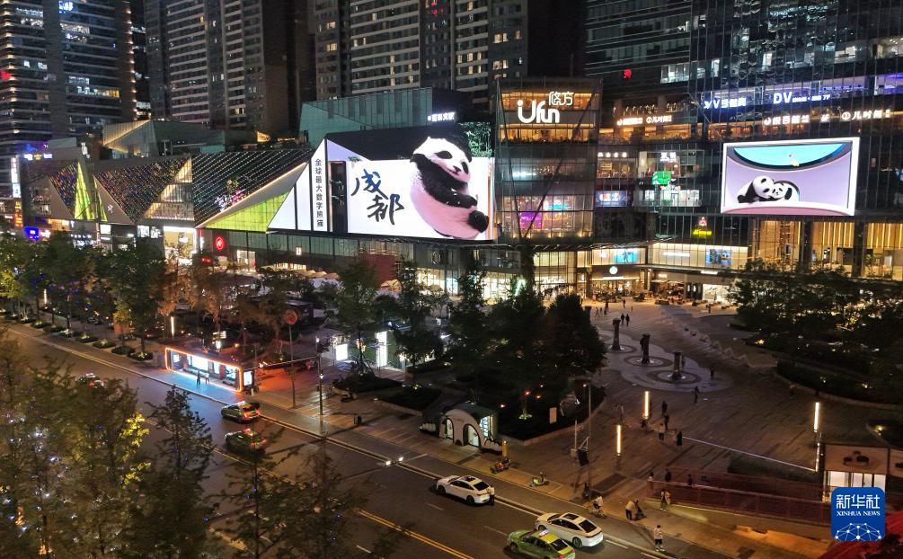 10月14日拍攝的裸眼3D數(shù)字熊貓與一旁交子雙塔的燈光秀(無人機(jī)照片)。