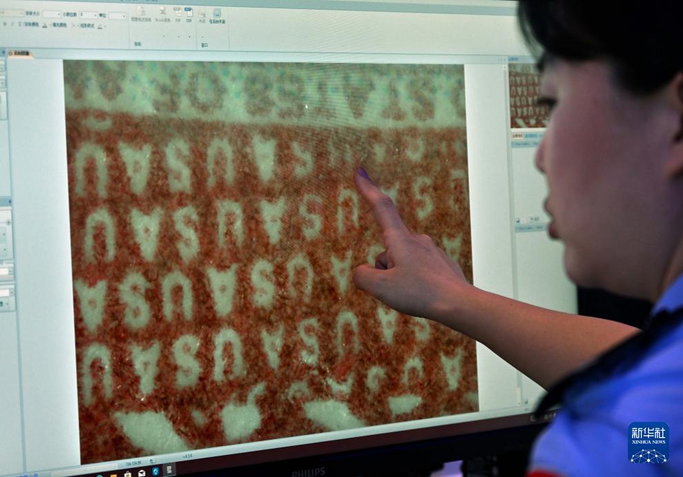 10月14日,青島機(jī)場(chǎng)邊檢站證研室內(nèi),移民管理警察通過光學(xué)儀器進(jìn)行簽證核查。