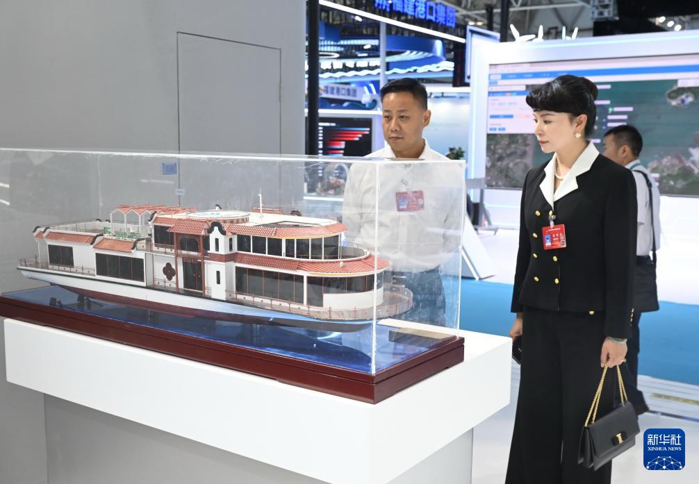10月16日,與會人員在寧德時代展區(qū)觀看“閩江會客廳”電動游船模型。