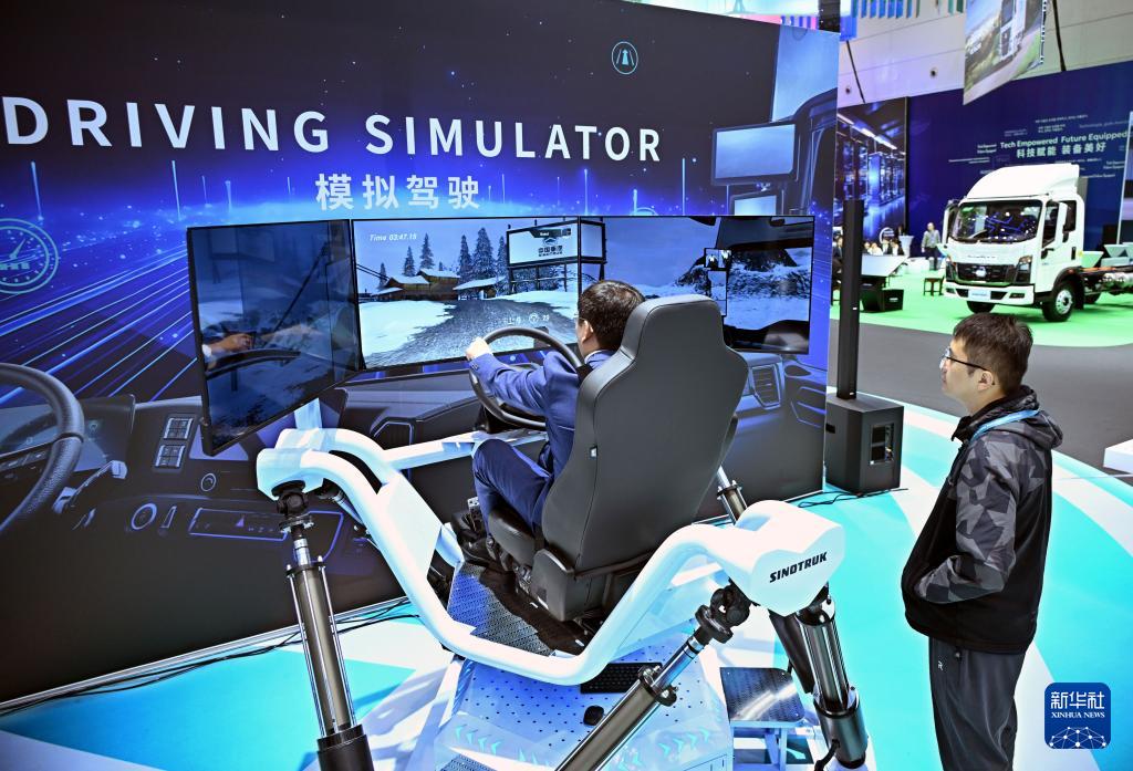 10月18日,與會(huì)人員在大會(huì)室內(nèi)展區(qū)體驗(yàn)卡車模擬駕駛。