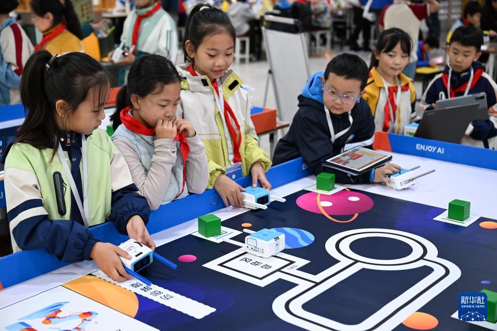 10月18日,學(xué)生在西安市新城區(qū)太華路小學(xué)參加人工智能創(chuàng)意編程挑戰(zhàn)賽。