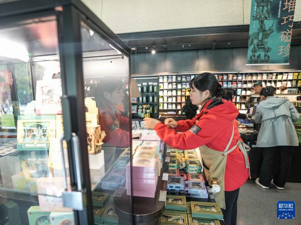 在四川省廣漢市三星堆博物館文創(chuàng)商店,工作人員往貨架上補充文創(chuàng)產(chǎn)品(10月30日攝)。
