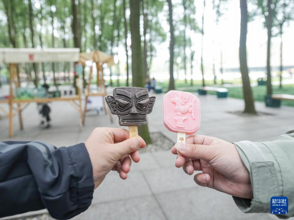 在四川省廣漢市三星堆博物館,兩名游客在展示文創(chuàng)雪糕產(chǎn)品(10月30日攝)。