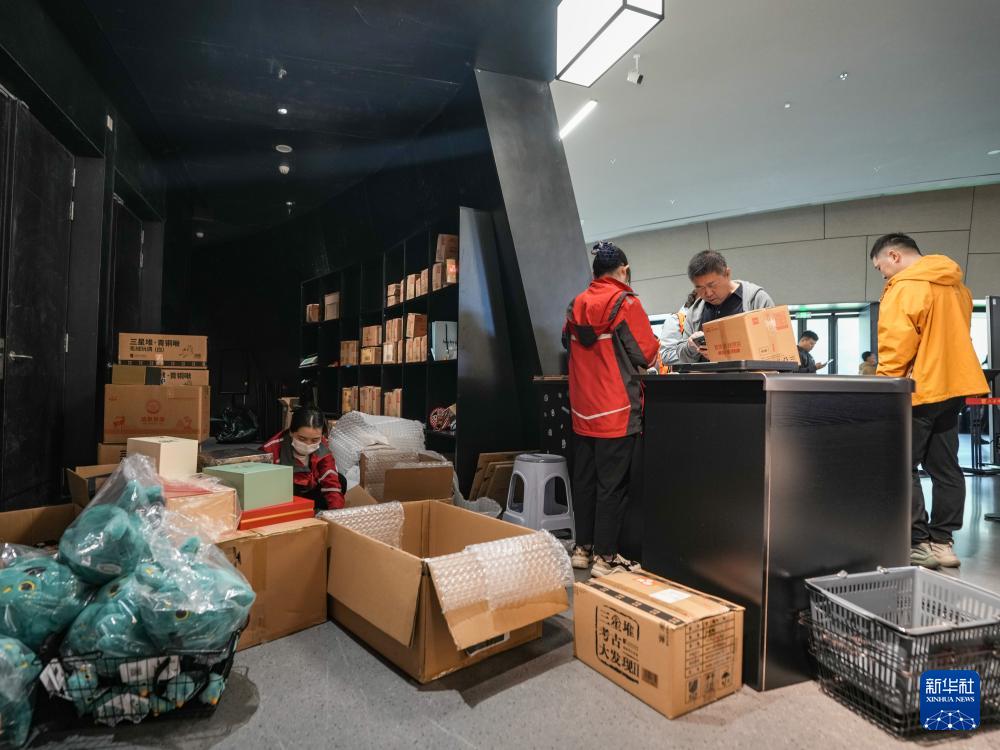 在四川省廣漢市三星堆博物館文創(chuàng)商店,現(xiàn)場快遞點工作人員將游客選購的文創(chuàng)產(chǎn)品打包發(fā)貨(10月30日攝)。
