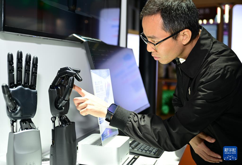 11月6日,在第八屆進博會技術(shù)裝備展區(qū),觀眾在觸摸一款靈巧手。
