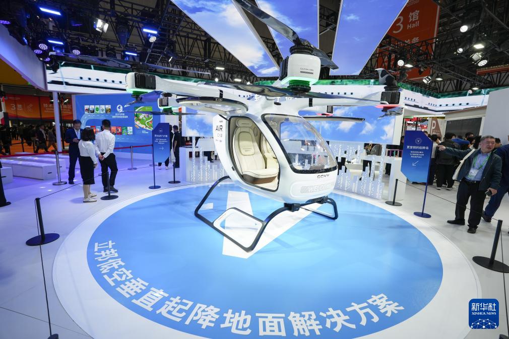 11月6日,在第八屆進博會汽車及智慧出行展區(qū)的科技展臺,展商(中)在向觀眾介紹E20 eVTOL電動垂直起降飛行器。