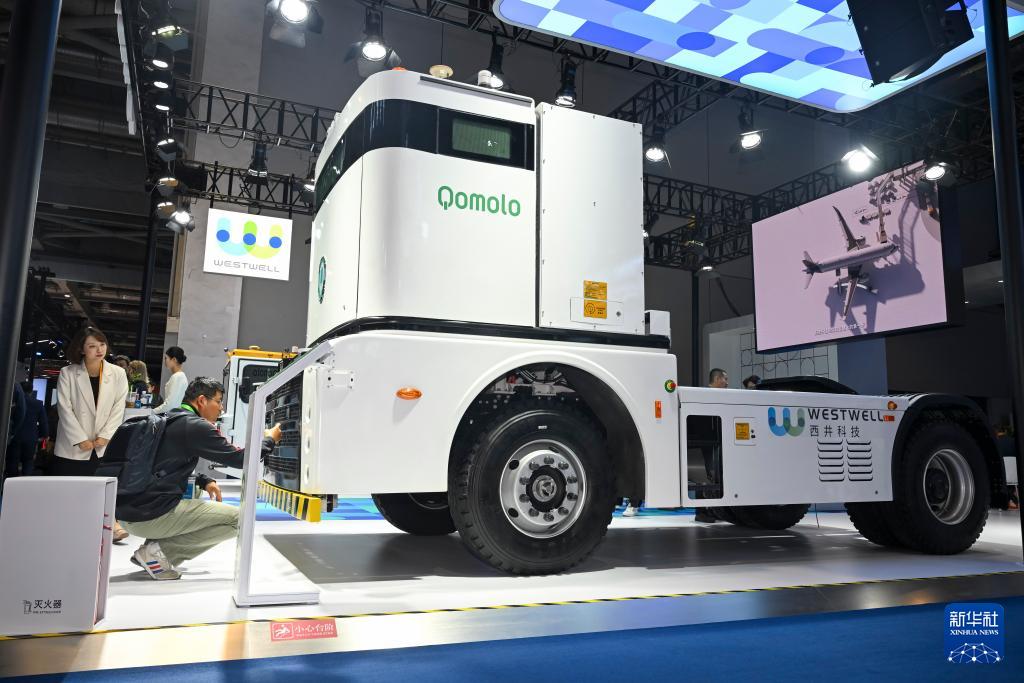 11月6日,觀眾(右)在第八屆進博會汽車及智慧出行展區(qū)西井科技展臺拍攝展品Q-Truck全時無人駕駛集卡。