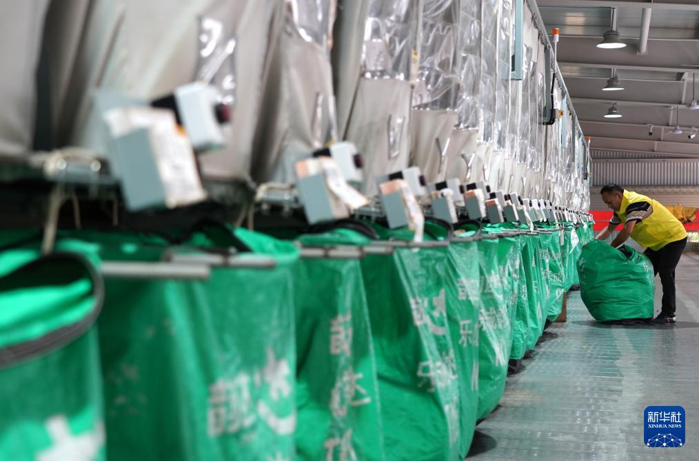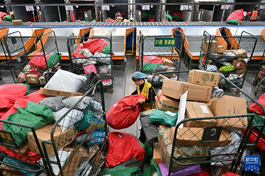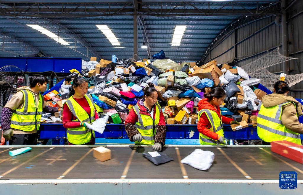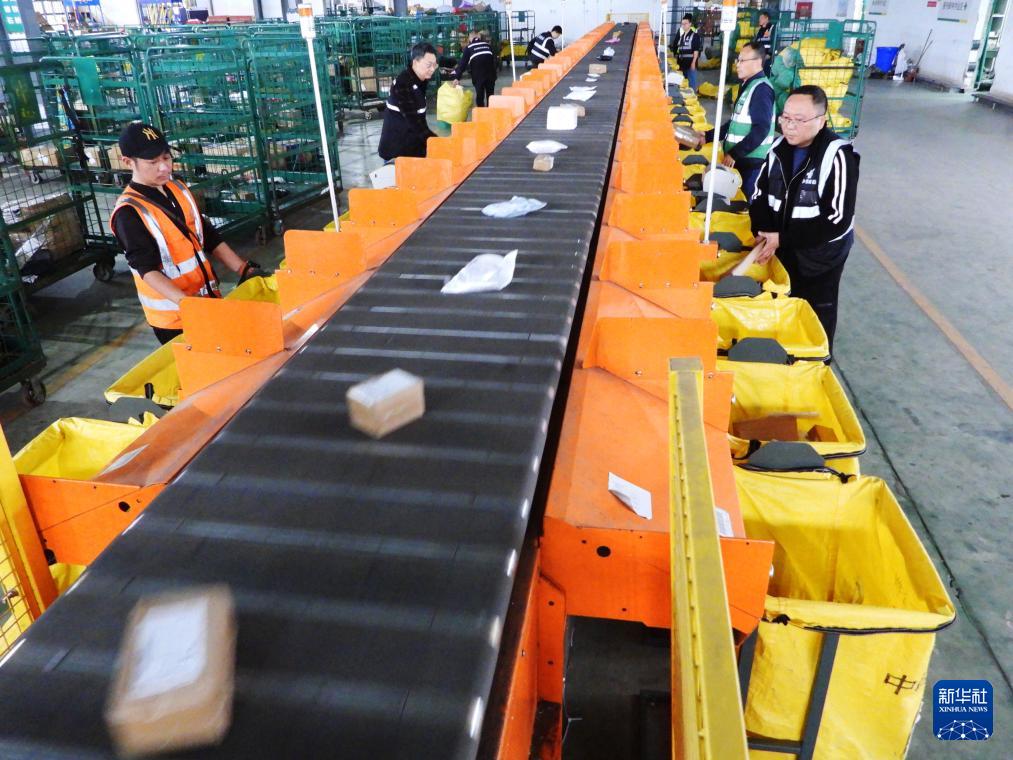 11月10日,工作人員在貴州省黔南布依族苗族自治州都勻市電商快遞物流園分揀包裹。