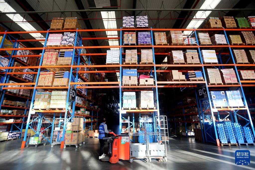 11月10日,在江蘇省連云港市連云區(qū)一家電商物流倉庫,工作人員在轉(zhuǎn)運貨物。