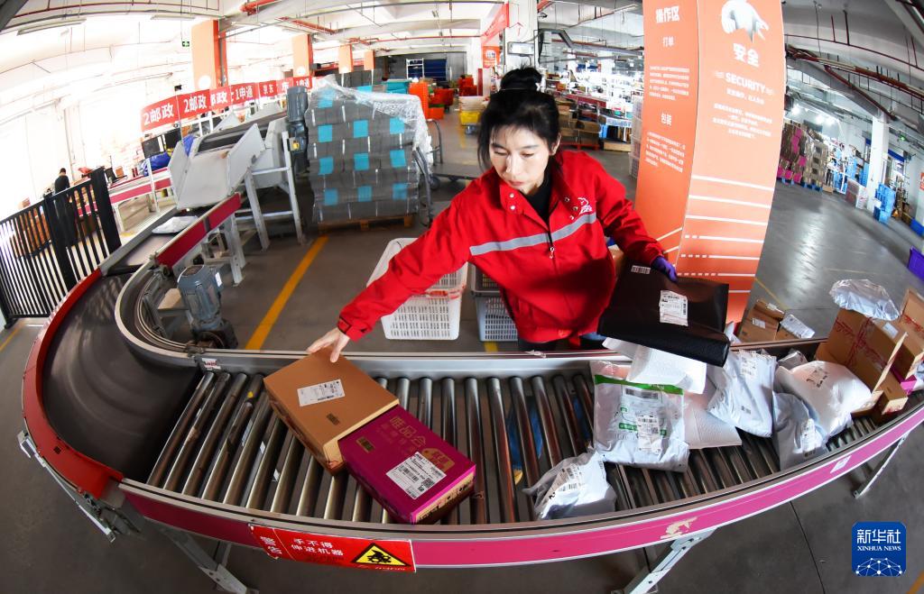 11月10日,工作人員在中國郵政集團(tuán)有限公司山東棗莊市分公司寄遞事業(yè)部網(wǎng)路運營中心分揀快遞。
