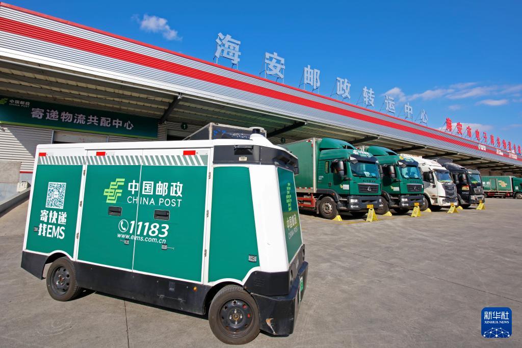 11月10日,在位于江蘇海安商貿(mào)物流產(chǎn)業(yè)園的海安市郵政轉(zhuǎn)運中心,無人配送車將快遞包裹運往城區(qū)攬投部。