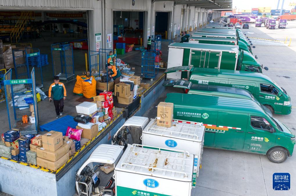 11月10日,在浙江省湖州市長興縣三點一線商貿(mào)物流共配中心,工作人員忙著將快遞裝車外運。
