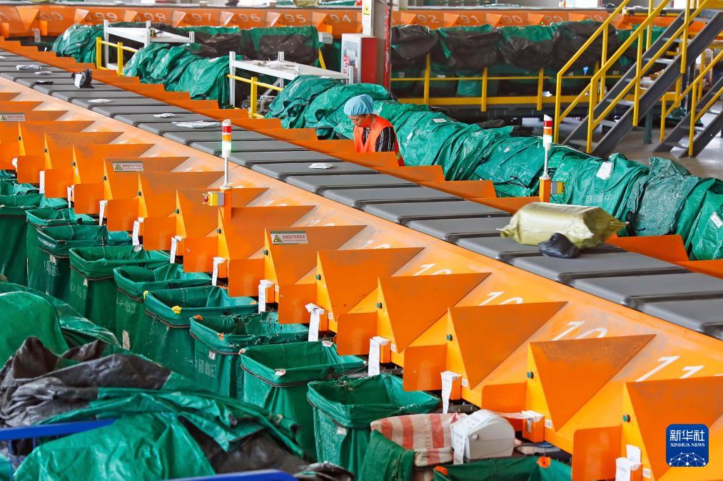 11月10日,工作人員在順豐速遞江蘇南通興東轉(zhuǎn)運中心的智能快遞分揀流水線上作業(yè)。