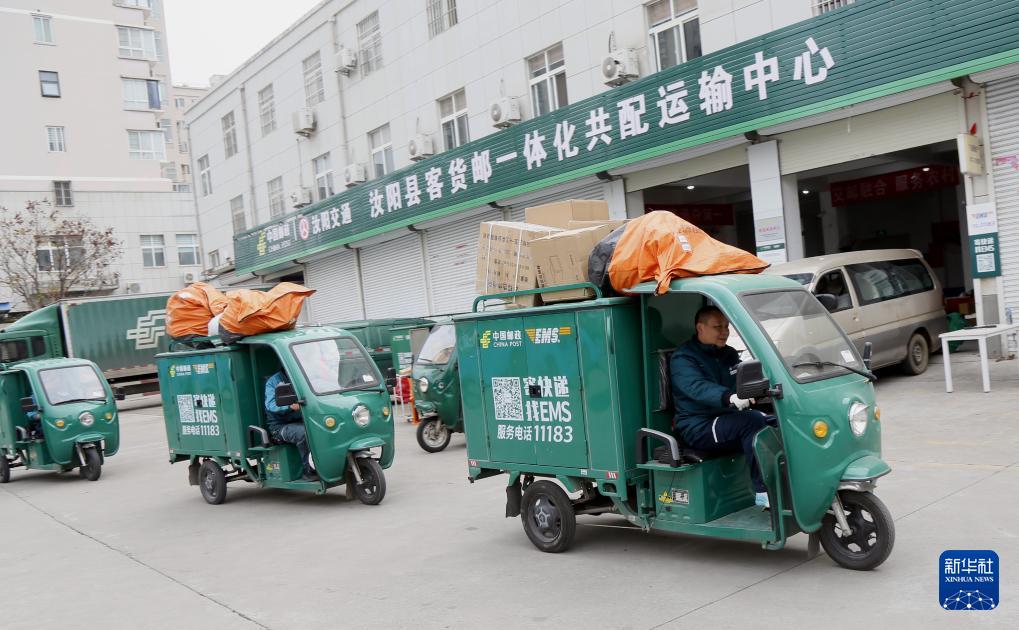 11月10日,在中國郵政集團(tuán)有限公司河南省汝陽縣分公司郵件處理中心,員工們給用戶送快遞。