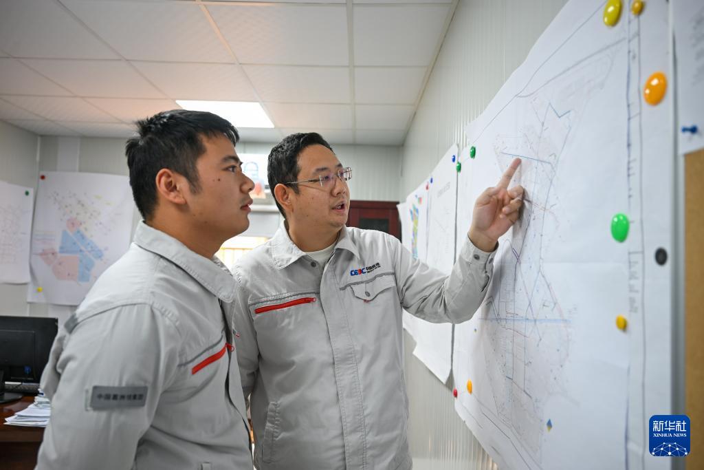 2025年9月9日,在科威特阿卜杜拉新城項(xiàng)目地,中國(guó)能建葛洲壩集團(tuán)員工查看項(xiàng)目規(guī)劃圖。