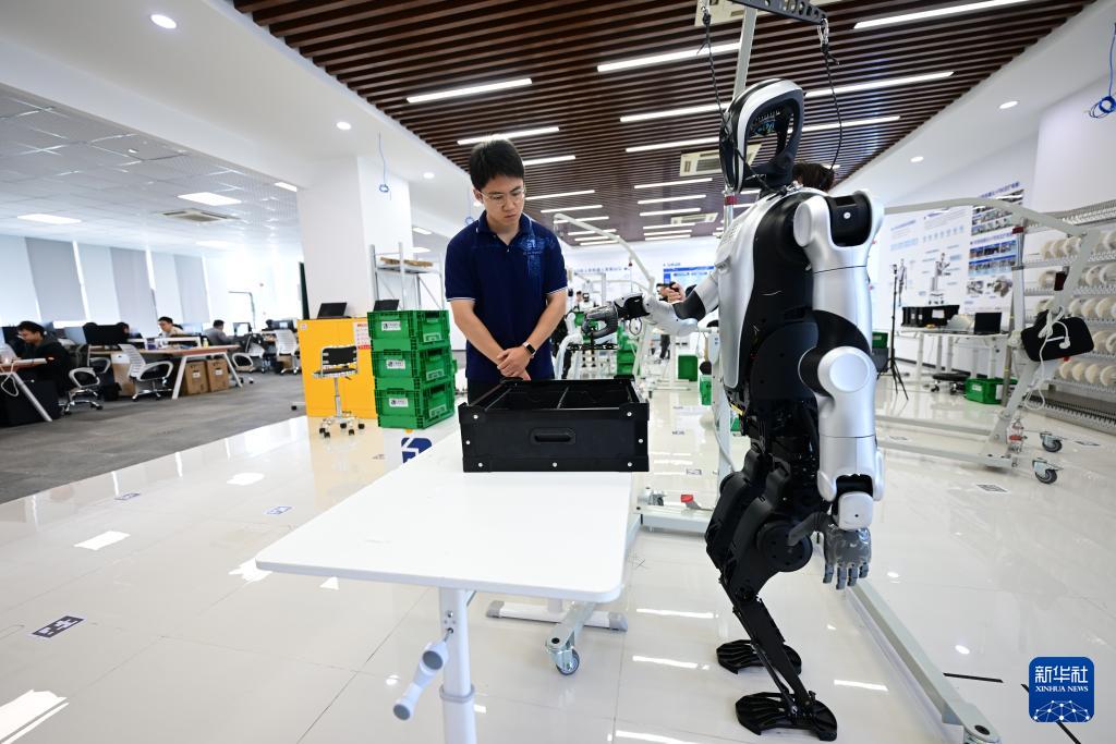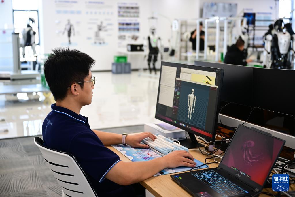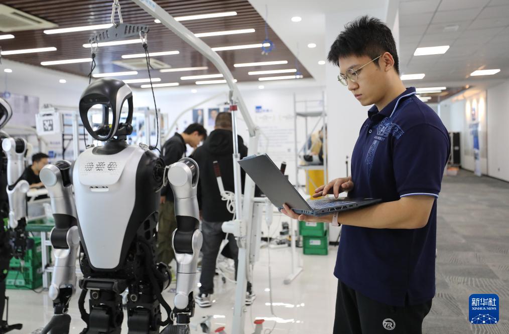 10月24日,在合肥樂聚機器人技術有限公司,工作人員在查看人形機器人的測試數據。新華社記者 杜瀟逸 攝