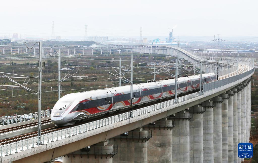 11月17日,一列試驗動車組通過西延高鐵富平特大橋(無人機照片)。