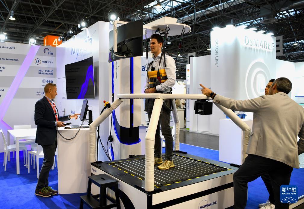 11月17日,一名參觀者在德國杜塞爾多夫國際醫(yī)療器械設備展上體驗康復設備。
