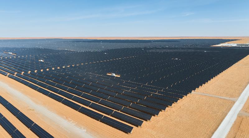 沙漠深處,一塊塊藍(lán)色光伏板如波浪般向天際延伸,它們靜靜地吸收著炙熱的陽光,將不毛之地變成巨大的“綠色電站”。