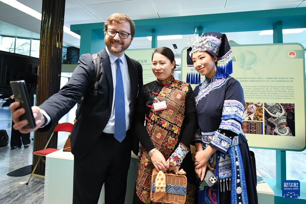 11月17日,在瑞士日內(nèi)瓦世界知識(shí)產(chǎn)權(quán)組織總部,一名參觀者在“中國(guó)(廣西)地理標(biāo)志產(chǎn)品展”上與身著民族服飾的工作人員合影。