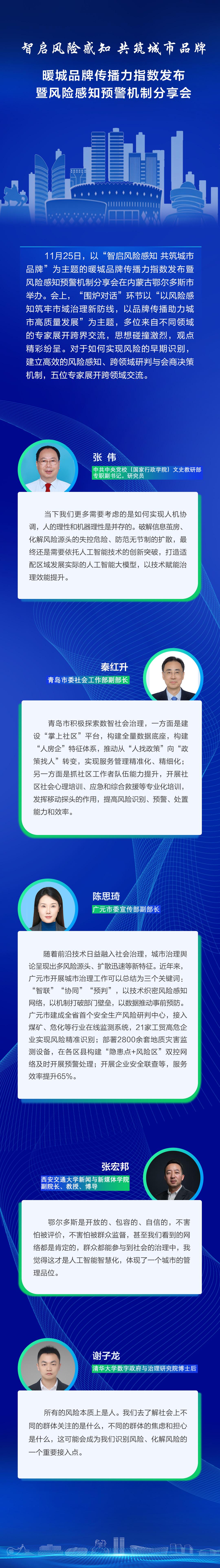 本報訊(記者 葉偉)11月25日,以“智啟風(fēng)險感知共筑城市品牌”為主題的暖城品牌傳播力指數(shù)發(fā)布暨風(fēng)險感知預(yù)警機制分享會在內(nèi)蒙古鄂爾多斯市舉辦。會上,“圍爐對話”環(huán)節(jié)以“以風(fēng)險感知筑牢市域治理新防線,以品牌傳播助力城市高質(zhì)量發(fā)展”為主題,多位來自不同領(lǐng)域的專家展開跨界交流,思想碰撞激烈,觀點精彩紛呈。對于如何實現(xiàn)風(fēng)險的早期識別,建立高效的風(fēng)險感知、跨領(lǐng)域研判與會商決策機制,五位專家展開跨領(lǐng)域交流。