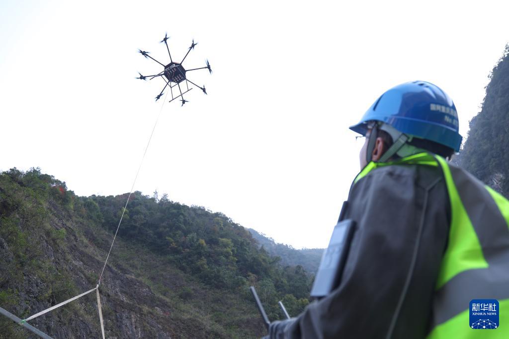 11月27日,在重慶市巫溪縣中梁鄉(xiāng)35千伏西土線(xiàn)改造現(xiàn)場(chǎng),現(xiàn)場(chǎng)工作人員操作重載無(wú)人機(jī)吊運(yùn)新建鐵塔塔材。