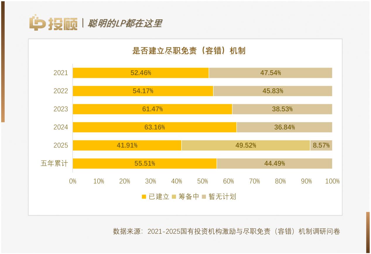 過去五年,容錯(cuò)機(jī)制的建立率經(jīng)歷了從初步普及到深度反思的一輪周期,已建立容錯(cuò)機(jī)制的機(jī)構(gòu)比例從2020年的52.5%一路穩(wěn)步攀升至63.16%,而2025年這一比例調(diào)整為41.91%,同時(shí)49.52%的機(jī)構(gòu)處于籌備研究階段。