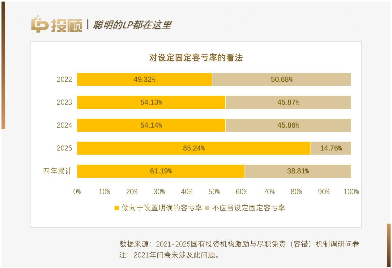在如何設(shè)定風(fēng)險(xiǎn)底線這一核心問題上,行業(yè)態(tài)度發(fā)生了較大轉(zhuǎn)變。在此前三年的調(diào)研中,約半數(shù)機(jī)構(gòu)反對(duì)設(shè)置固定的容虧比例,傾向于彈性管理。然而2025年的調(diào)研顯示,僅16.19%和13.33%的機(jī)構(gòu)分別在早期和中后期投資中堅(jiān)持“不應(yīng)當(dāng)設(shè)定固定容虧率”,多數(shù)機(jī)構(gòu)轉(zhuǎn)而尋求明確的、可量化的虧損容忍比例,以此作為合規(guī)免責(zé)的硬性依據(jù)。