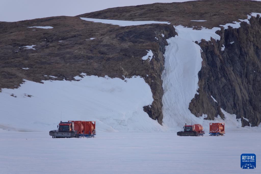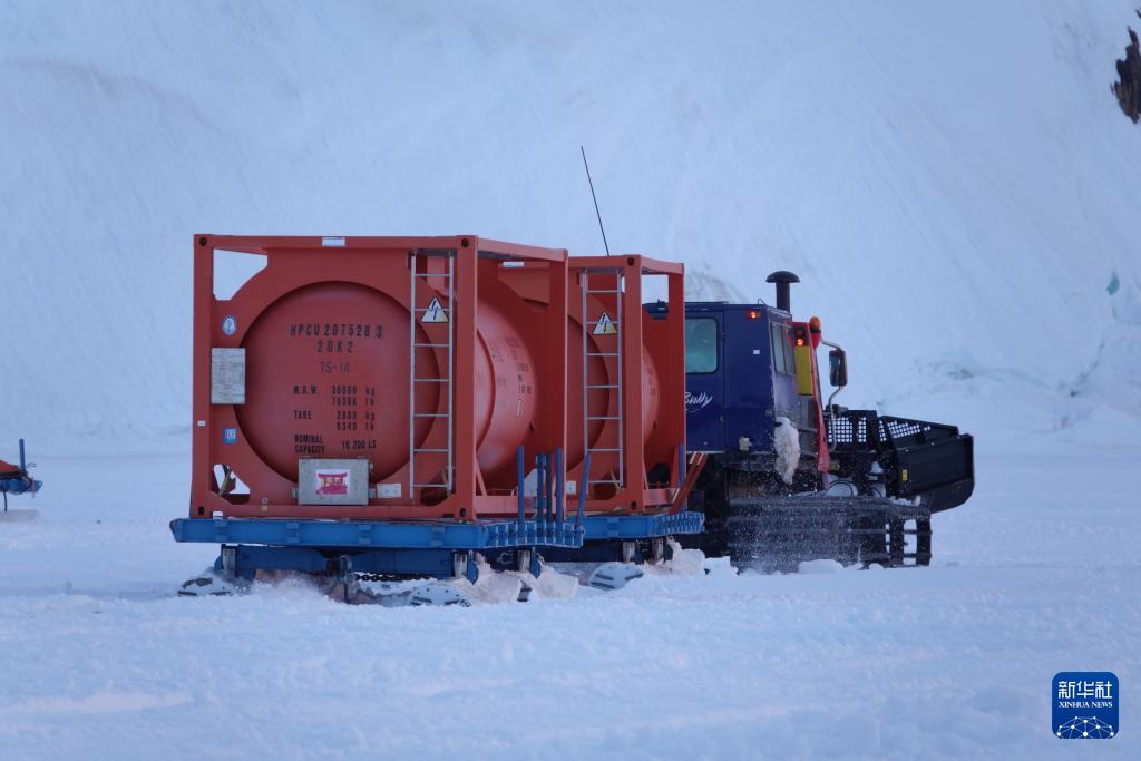 北京時(shí)間12月3日凌晨,雪地車?yán)訚M燃油的油罐離開“雪龍2”號(hào),駛向中山站。