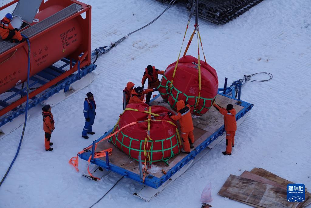 北京時(shí)間12月2日傍晚,工作人員在冰面上進(jìn)行油囊加注作業(yè)。