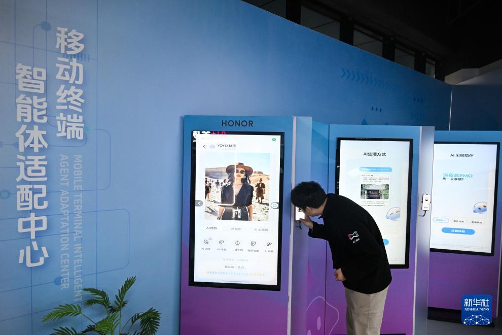 12月4日,在南京人工智能生態(tài)街區(qū)的“AI·模坊”南京智能體集散中心,工作人員與智能移動終端互動。