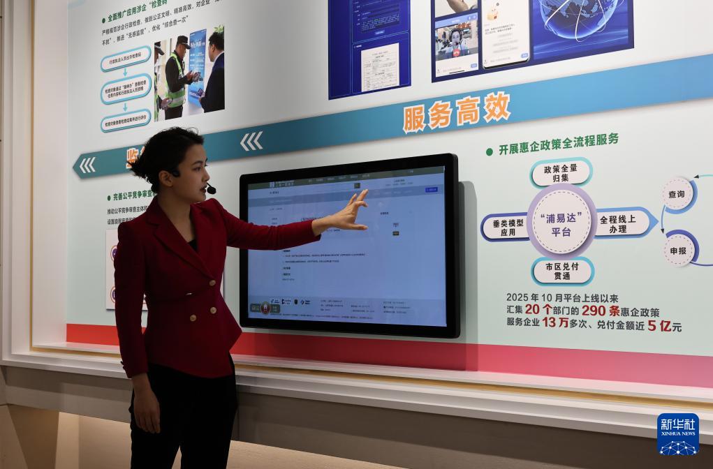 12月6日,講解員在觸控屏幕前為參觀者介紹上海一網(wǎng)通辦“浦易達”平臺的功能。