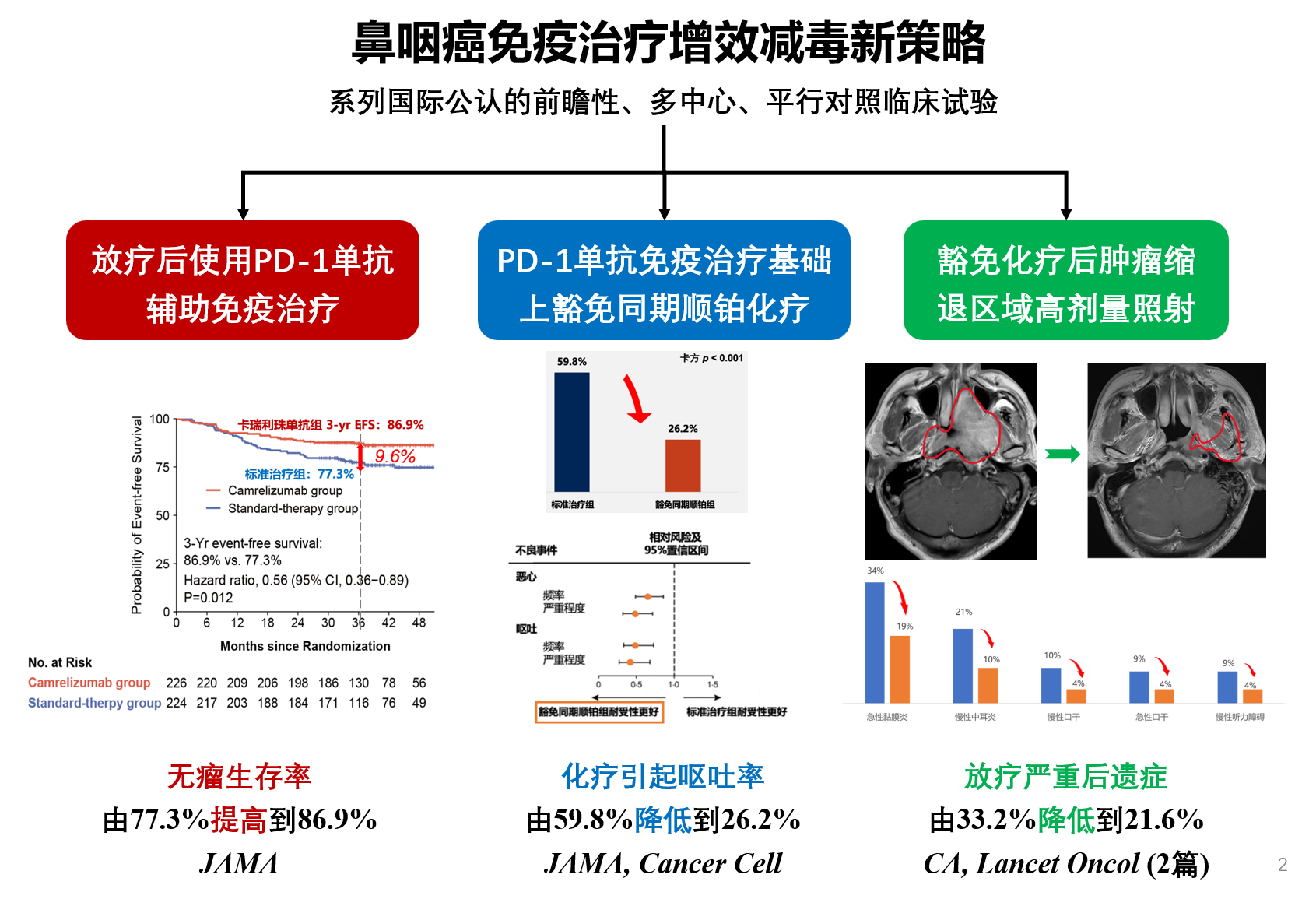 中山大學(xué)腫瘤防治中心孫穎、馬駿團(tuán)隊(duì)通過(guò)一系列國(guó)際公認(rèn)的前瞻性、多中心、平行對(duì)照臨床試驗(yàn),在鼻咽癌增效方面,證實(shí)放療后使用PD-1單抗輔助免疫治療,可將失敗風(fēng)險(xiǎn)降低了44%,生存率由77.3%提高到86.9%;在減毒方面,研制出在PD-1單抗免疫治療基礎(chǔ)上豁免同期順鉑化療,不降低療效的同時(shí),將化療引起嘔吐率由59.8%降低到26.2%;并制定了“豁免化療后腫瘤縮退區(qū)域高劑量照射”,使放療嚴(yán)重后遺癥由33.2%降低到21.6%。由此,創(chuàng)立了鼻咽癌免疫治療“增效減毒”新策略。