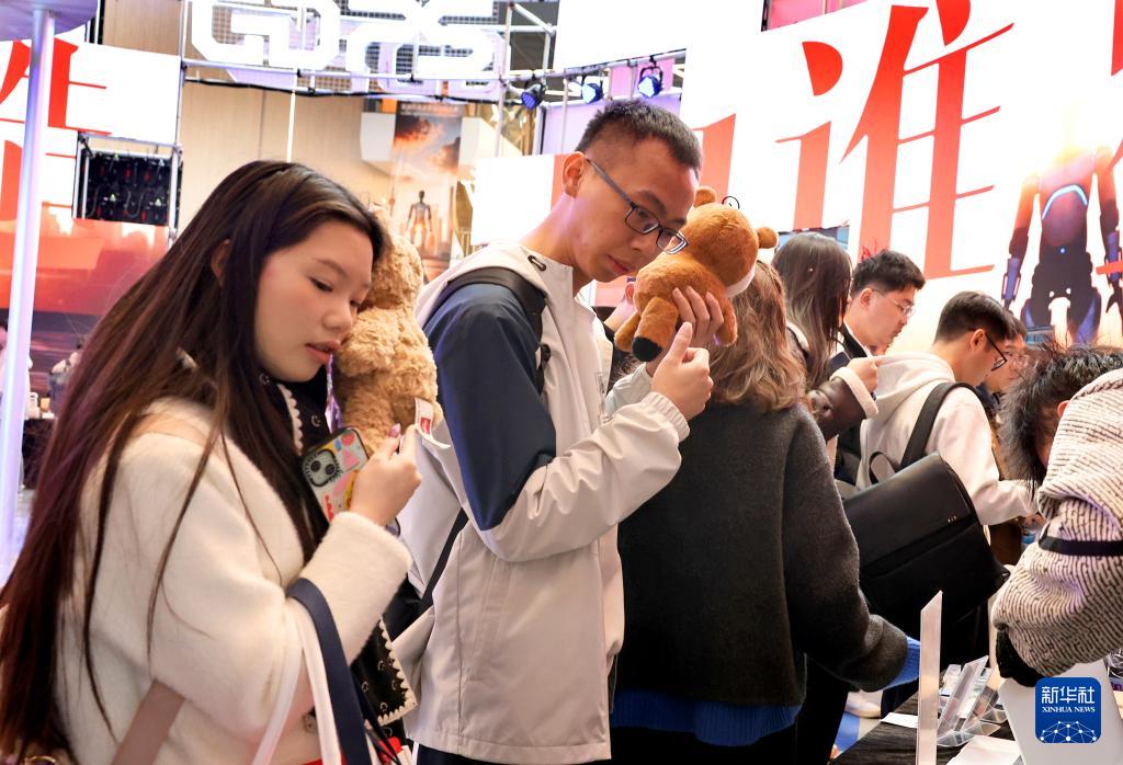 12月12日,參觀者在AI智能陪伴機(jī)器人展位前體驗產(chǎn)品互動功能。