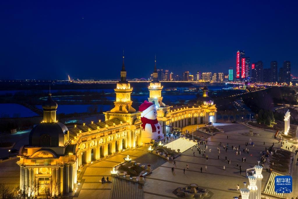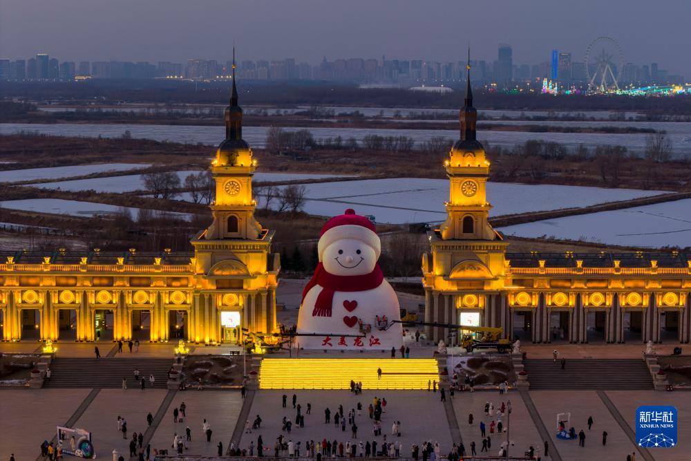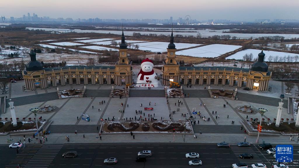 12月15日,游客在哈爾濱市群力音樂公園參觀大雪人(無人機照片)。