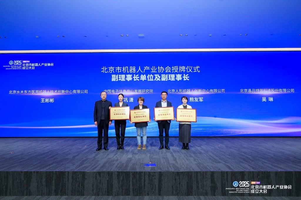 揭牌儀式后,大會(huì)依照協(xié)會(huì)章程,完成第一批副理事長單位授牌。中國電子信息產(chǎn)業(yè)發(fā)展研究院、北京人形機(jī)器人創(chuàng)新中心有限公司、北京水木東方醫(yī)用機(jī)器人技術(shù)創(chuàng)新中心有限公司、北京晶品特裝科技股份有限公司,被推選為協(xié)會(huì)副理事長單位,鞏瀟、熊友軍、王彬彬、吳琳4位同志分別代表各單位出任副理事長。