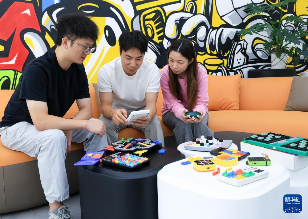 10月29日,在廣東佛山順德的廣東工業(yè)設(shè)計(jì)城,計(jì)客創(chuàng)始人蘇梓銘(中)與員工一起討論公司的智能益智玩具產(chǎn)品。