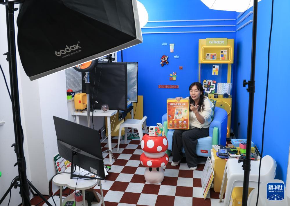 10月29日,在廣東佛山順德的廣東工業(yè)設(shè)計(jì)城,計(jì)客主播在直播平臺(tái)介紹超級(jí)積木玩具。