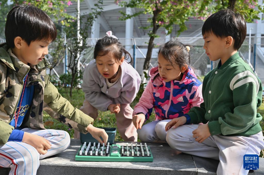 12月27日,在廣州一體育場(chǎng)外,幾名兒童在一起玩計(jì)客智能軍棋玩具。