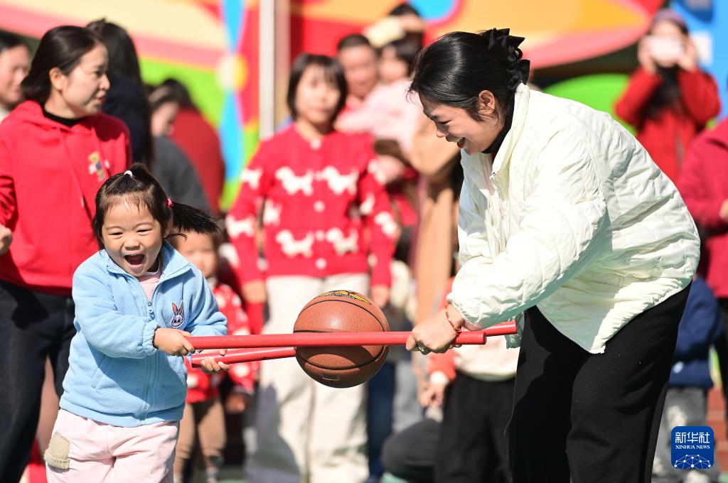 12月30日,在江西省贛州市章貢區(qū)第十五保育院,小朋友和家長(zhǎng)在玩“合力運(yùn)福球”趣味游戲。