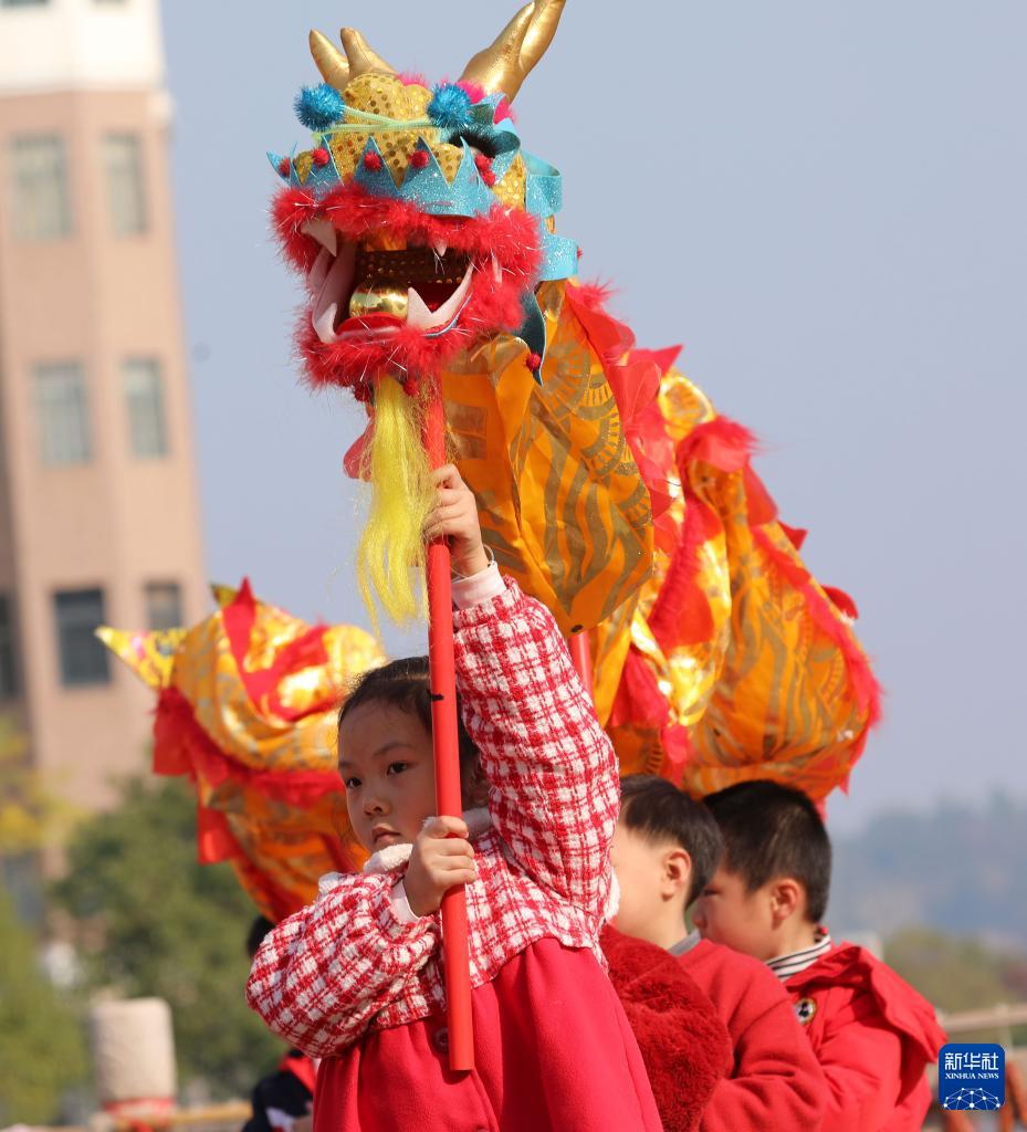 12月30日,江西省吉安市泰和縣淺水灣幼兒園小朋友在表演舞龍。