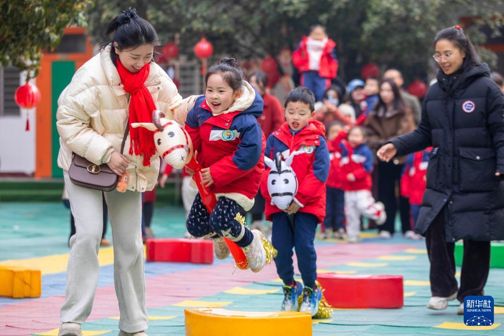 12月30日,學(xué)生在湖北省襄陽(yáng)市樊城區(qū)第五幼兒園開展的迎新年親子活動(dòng)中進(jìn)行趣味游戲。