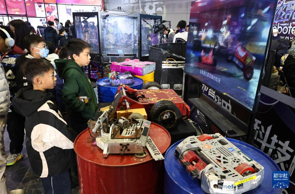 1月2日,參觀者在一組參加機(jī)器人格斗比賽的機(jī)器人展品前駐足觀看。