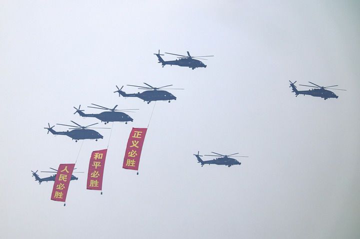 80響禮炮震徹云霄、8萬羽和平鴿振翅飛翔,“正義必勝!和平必勝!人民必勝!”的昂揚之聲久久回蕩。