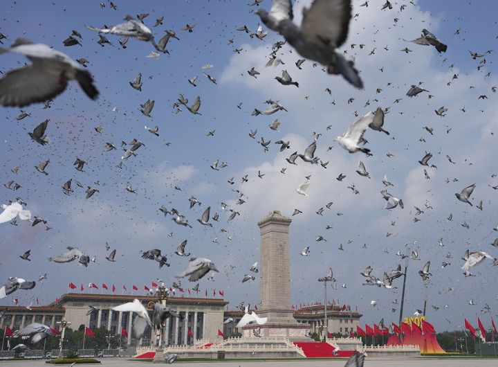 2025年9月3日,紀念中國人民抗日戰(zhàn)爭暨世界反法西斯戰(zhàn)爭勝利80周年大會在北京隆重舉行。這是紀念大會現(xiàn)場放飛鴿子。新華社記者 牟宇 攝